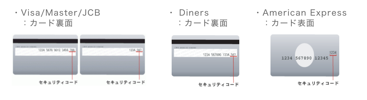 セキュリティコードとは、クレジットカードがお客様のお手元にあることを確認するための手段として使用されるクレジットカードの裏面または表面に記載された3桁もしくは 4 桁の番号を指します。 ※カード会社により表示箇所および名称が異なります。(下記図参照)